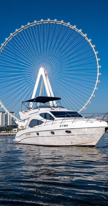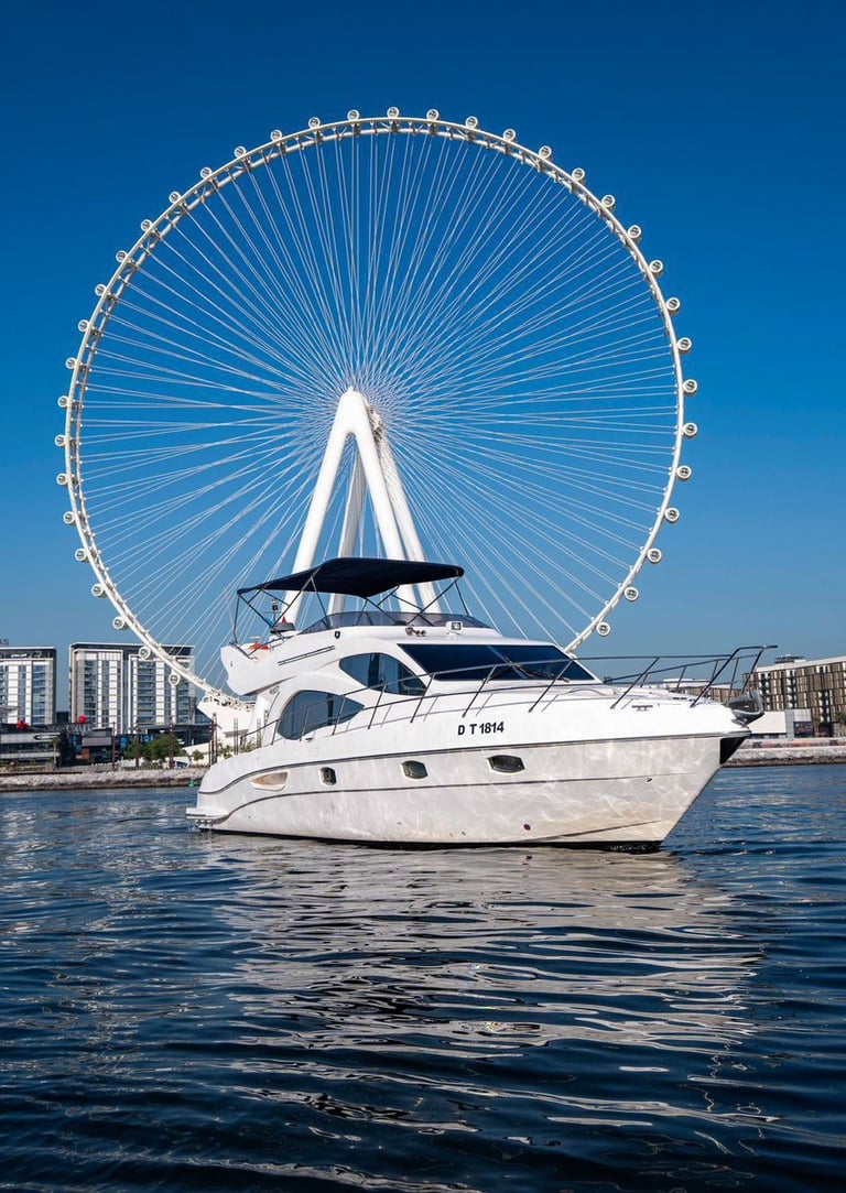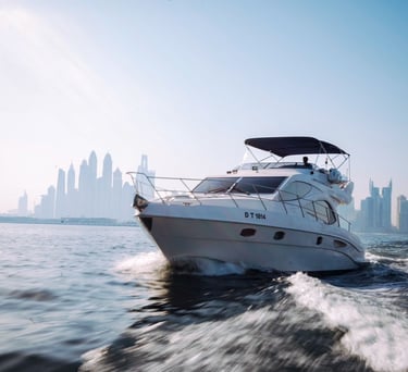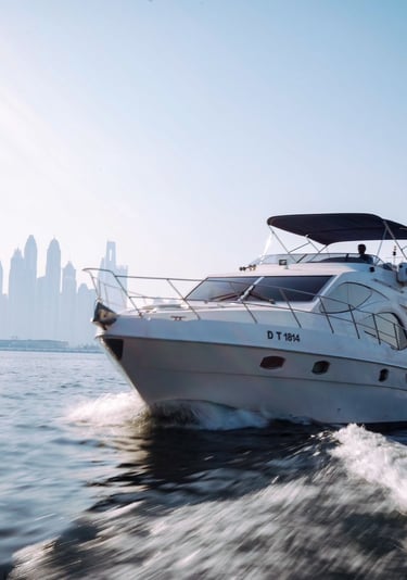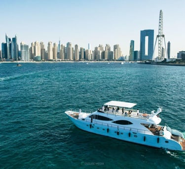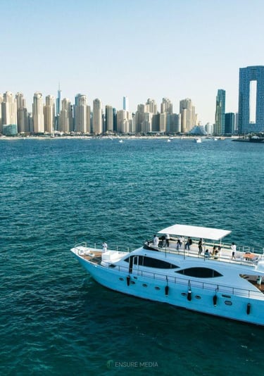 Luxury yacht charters for private cruising, events, and special occasions. Available from Dubai Marina and Dubai Harbour, with professional crew, custom routes, and optional catering or entertainment arranged on request.